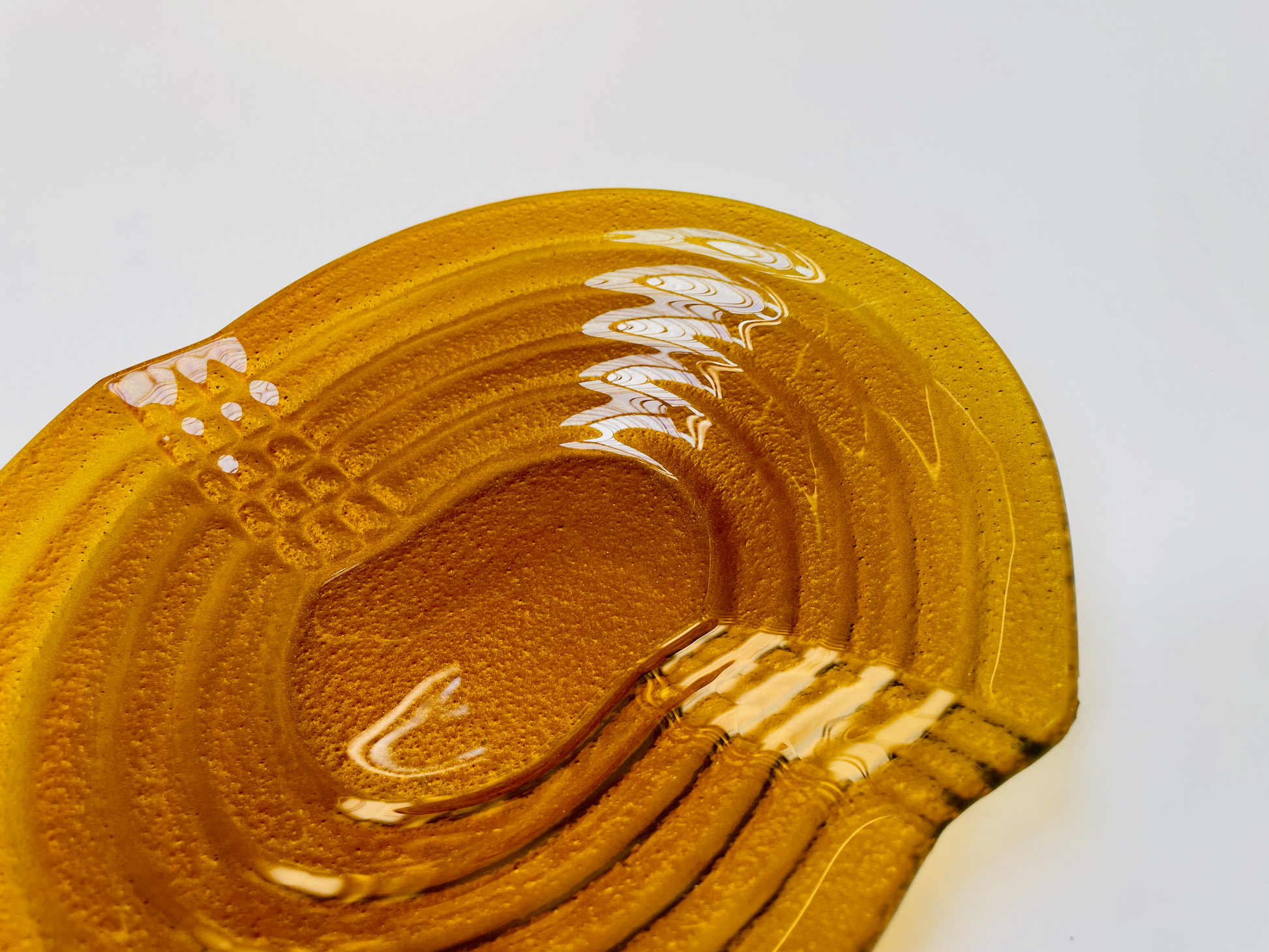 Crafted with expert precision, the STAP design glass fruit bowl measures 25 x 22 cm and features a unique honey gold color. Inspired by Art Nouveau aesthetics, this handmade piece combines elegant curves with rich, warm hues to highlight your fruit display with artistic flair. Its exquisite craftsmanship ensures both beauty and durability, making it a refined centerpiece for any table.