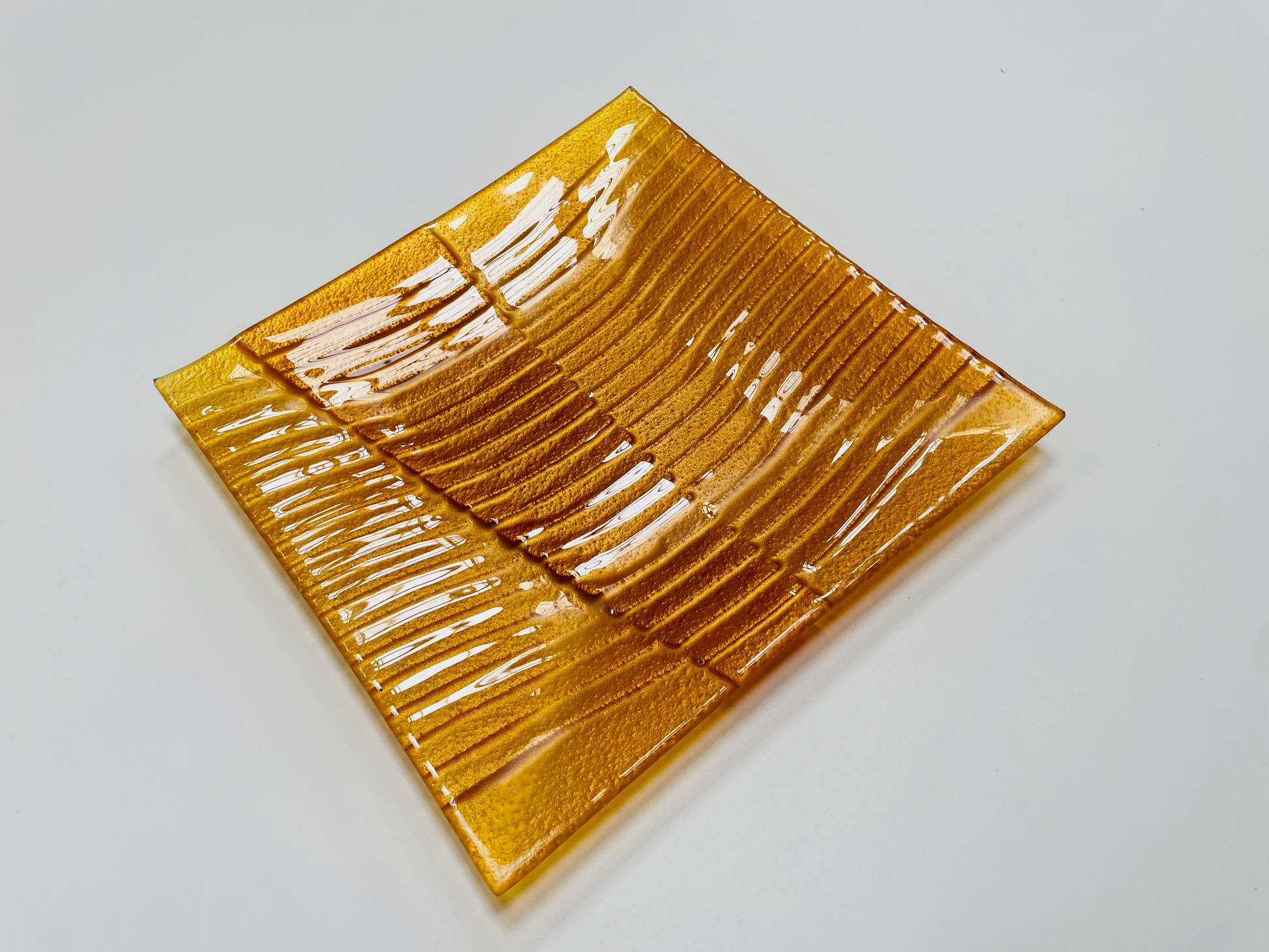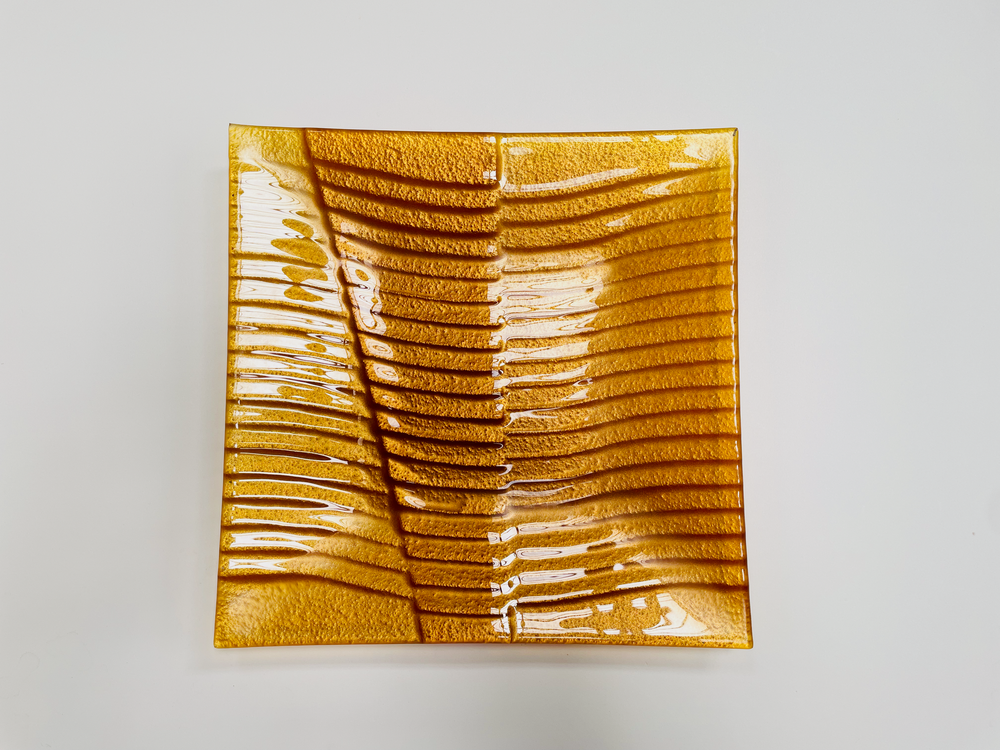Crafted with expert precision, the STAP design glass plate measures 27 x 27 cm and features a unique honey gold color. Inspired by Art Nouveau aesthetics, this handmade piece combines elegant design with rich, warm hues to highlight your fruit display with artistic flair. Its exquisite craftsmanship ensures both beauty and durability, making it a refined centerpiece for any table.